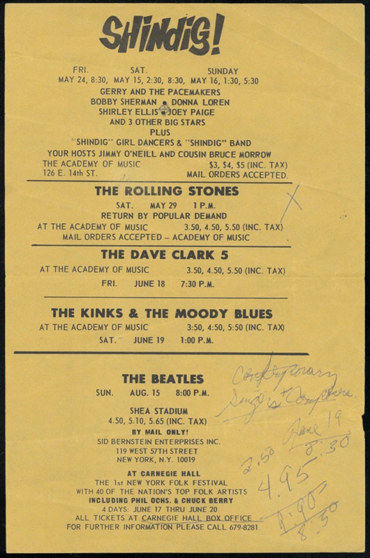 Extremely rare flyer billing upcoming acts to appear in New York that summer -- capped by the Beatles' now legendary Shea Stadium concert on August 15th and also distinguished by a Rolling Stones' May 29th gig at the Academy of Music. The latter venue was also played by the Dave Clark 5, Kinks, Moody Blues & a touring troupe from the "Shindig!" TV show. Another was a Phil Ochs/Chuck Berry gig at Carnegie Hall. The oddity here is that the type size for the Beatles is no larger than the others, making it seem as if the Fab Four actually were part of a the Shindig show! In reality, of course, the Beatles were on a whole other level. The Shea appearance would set records when more than 55,000 fans paid their way in, and the band came away with a $160,000 share of the $304,000 gross receipts. By comparison, the others --including the Stones -- had to make do with mere pocket change. The 5.5 x 8.5" yellow flyer is VG-EX with some fold marks and idle pen notations. Quirky confluence of history, and it's sure nice seeing the "Shindig Girl Dancers" get their due.