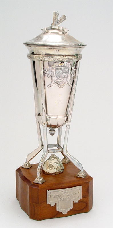 Ornate Prince of Wales Trophy awarded to Assistant General Manager Tom Johnson of the 1987-88 Boston Bruins. The Bruins received the award for winning the Wales Conference and advancing to the Stanley Cup finals against the Edmonton Oilers. Johnson was inducted into the Hockey Hall of Fame in 1970 and has been involved in the B’s organization for over 30 years. In excellent plus condition despite missing a single leaf at the top. Comes with a Letter of Authenticity from Johnson.