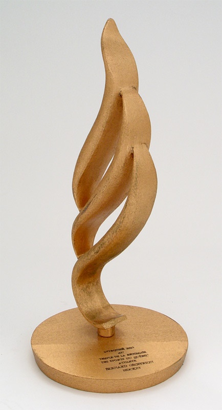 Artistic scuptured trophy given to Bernie Geoffrion to commemorate his induction into the Quebec Sports Hall of Fame in 2003. The moment has been captured in French on the inscribed base. Substantial and quite heavy. Comes with a Letter of Authenticity signed by Geoffrion.