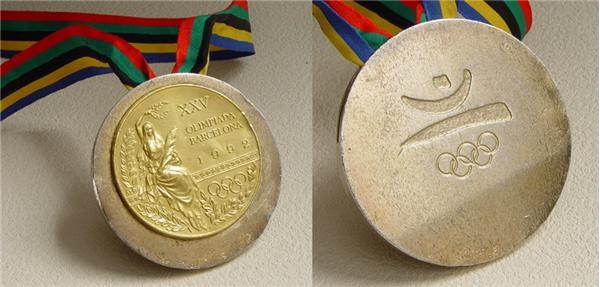 Stunning gold medal from the 1992 Summer Olympics won by Alberto Hernandez of Cuba for baseball. Resting on a 5 colored ribbon, the medal features the 5 Olympic rings with “XXV Olympiada Barcelona, 1992” engraved on the gold face along with the Greek goddess Nike holding an ear of corn in one hand and a wreath in the other. Gorgeous medal is almost 3 ?” in diameter and neatly displayed in a handsome black frame. Comes with an LOA EX-MT.