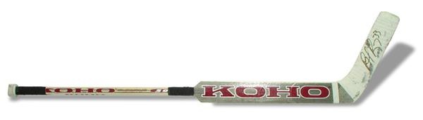 With 500-plus wins and counting, every two points during Patrick Roy's final season represented an NHL record. Patrick used this Koho 590 model while with the Avs during the 2002-03 season. Stamped “P. ROY” on the shaft with white tape on the knob, paddle and blade with black gauze grips. Shows nice use! Giant gold signature across the blade tape.