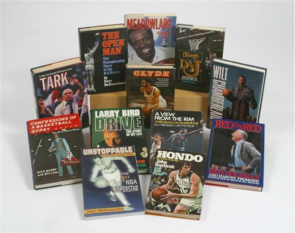 Terrific group of vintage basketball books signed by the legends of the game. This collection of 58 books include works signed by Bill Russell, Wilt Chamberlain, Bob Cousy, Bill Bradley, John Havlicek, Walt Frazier, Magic Johnson, Larry Bird, Dave DeBusschere, George Mikan, Earl Monroe, Willie Reed, Oscar Robertson, John Wooden, Jerry West, Bill Walton, Rick Pitino, Jim Valvano, Dick Vitale, Michael Jordan and many more. Books average NRMT, autographs average a "9" out of a possible 10.