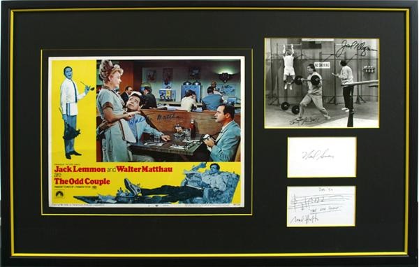 The ulitmate autograph collection for "Odd Couple" fans sits in this handsome 30 x 19" black frame. Both Jack Lemmon and Walter Mattau signed a 10 x 14" poster showing a full-color scene from the 1968 film version of "The Odd Couple" in which Lemmon and Matthau order food in a diner. Matthau signed in blue sharpie and his autograph rates an "8.5" out of 10, Lemmon in black sharpie rating a "9.5" out of a possible 10. Poster numbered 68/163. Also a 7 x 8" photo from the TV series showing Jack Klugman, Tony Randall and Al Molinaro in a scene from the episode "Decathlon". signed by Randall and Klugman in black sharpie with Randall's autograph rating an "8" out of a possible 10 and Klugman's a "9.5". Cut autographs of playwrite Neil Simon and composer Neal Hefti who wrote the famous theme song used in both the film and TV show are also matted in this frame. Simon's autograph rates a "9.5" out of a possible 10 while Hefti's rates a "9". Overall NRMT.