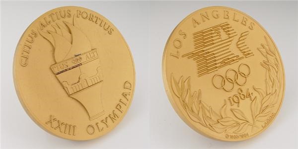 The 1984 Los Angeles Participation Medal was awarded to athletes, coaches and judges who took part in the 1984 Games. The front of the medal features the Los Angeles Olympic emblem over fleeting stars, the Olympics interlocking ring symbol and a quilt of leaves. Reverse has the Olympic torch. 2 1/4" in diameter gold mdeal made of bronze. Absolutely MT+. Comes with the original blue velvet case.