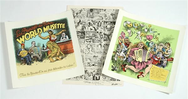 From the bizarre mind of the comic genius, Robert Crumb, come these limited editions. Two are signed and numbered by Robert and printed via silkscreen on “rag art paper”: “Les Primitifs du Future World Musette” (2001-88/130) and “Cocktail D’Amour” (2002-13/34). The third is a signed b&w poster, “Rotten to the Core”, for a 1989 Zap Comix show at the Psychedelic Solution Gallery in New York City. All signatures and prints NRMT.