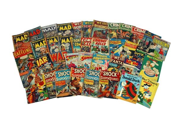 Tremendous collection of mostly action comic books from the early '50s, though the real finds are 9 early issues of MAD -- including MAD #1, October-November 1952, which in mint conditon is worth over $10,000. The MAD #1 cover reads "Tales Calculated To Drive You...MAD," and "Humor in a Jugular Vein" and the initial pieces include "Enter Cosmo McMoon" and "Crow Vadis?" (Don't look for Alfred E. Neuman; he didn't arrive until issue #21.) V-VG with front and back cover damage though the inside pages are fine except for overall browning. Others MADs are #s 2, 5, 6 (no cover), 7, 9 (no cover), 17, 27, 63. Other super-rare titles include "Detective Comics #171", "Batman #80", "Tales from the Crypt #35", "Lash Larue #55", "Weird Fantasy #14", "Weird Science-Fantasy #28", "Amazing Adult Fantasy #13" and "The Haunt of Fear #19", as well as vintage Disney comic books. Most books run from VG-EX with acceptable cover damage and very nice interior pages.