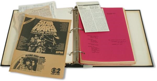 The 1978 Star Wars Holiday Special brought to TV the incredibly successful Star Wars imprint, and the show has a cult status all its own, for a very different reason -- George Lucas hated the show so much he ordered that it never be shown again. This of course gives the original script much added value. Contained in an impressive black binder engraved "The Star Wars Holiday Special", the script includes "inside" stuff like rehearsal and shooting schedules, and some reviews. A must-have for Star Wars aficianados.