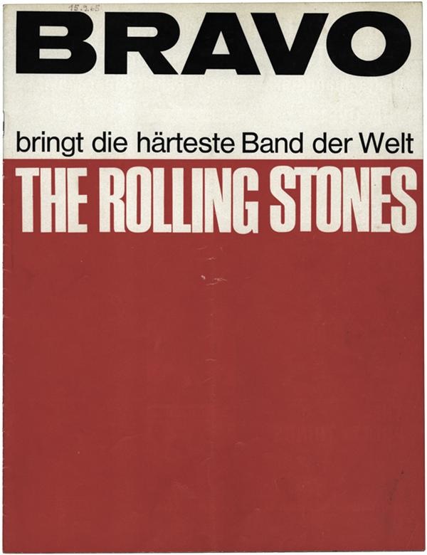 Very hard to find program from the Stones' '65 German tour. The cover blares "Bravo" and, in German, "the hardest rock band in the world" over a red coated block with "Rolling Stones" in white block letters. Great centerfold shot of the band and a discography celebrating the "Beat aus Liverpool," or "Liverpool beat." In the program are blurbs for some of the inferior acts who appeared with them such as the Rivets and the Liverbirds. 8 x 11" program is stunning, in uncompromised MT condition.