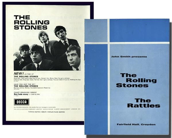 The Stones had yet to record an original song when they played a 1964 concert at Fairfield Hall in Croydon, sharing the bill with the Rattles (no, not the Beatles or the Rutles). In this gig, typical of the scores of low-level, dues-paying appearances they had to make to spread their reputation, they closed the show while the Rattles closed the first act and others such as The Barracudas played in between. Great Stones artifact with a two-toned blue cover, and absolutely mint.