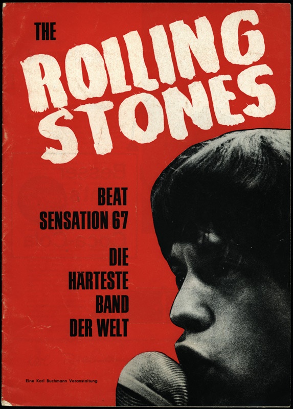 Extraordinarily rare program from the group's 1967 German tour features a bright orange cover with a closeup image of Jagger singing into a microphone and screened-on pictures of each Stone on the back cover. Also on the tour were the Easybeats, the Creation and -- believe it or not -- the Batmen, who are shown in capes, boots and bat logos on skintight costumes. Great centerfold picture of the Stones and a detailed discography. Amazingly well preserved with the most minor damage on the cover. Pristine inside. EX-NRMT.