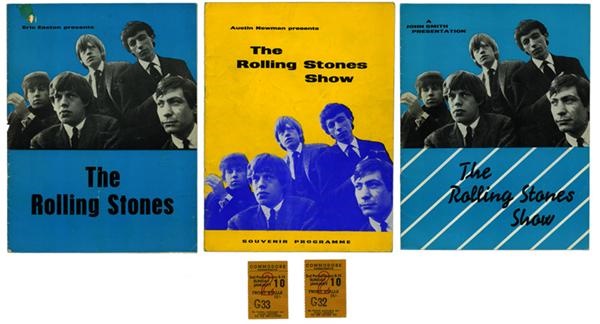 Three Stones programs from the summer of '64 when they were the main act on a British caravan of rock acts, with stops in places like Bournemouth, Torquay, Weymouth and Plymouth. While little would become of the Overlanders, the Barron Knights and the Five Embers, within a year the Stones would be off the smalltime circuit and touring America and Australia. All covers feature a group shot of the Stones, two covers blue, one yellow. EX-NRMT, with one of the blue programs showing some adhesive damage. Includes two "front stall" ticket stubs from one concert in Hammersmith.