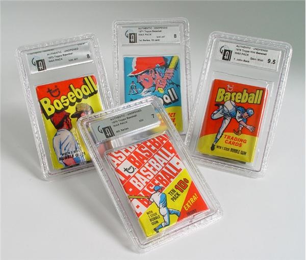 1970-1985 Topps baseball wax pack run. The following are standard issue Topps wax packs (except for 1974). All but three have been graded by GAI, Global Authentication: 1970 4th Series “7, 1971 1st Series “8, 1972 “8.5, 1973 5th Series “8, 1974 2-card pack “7.5, 1975 Mini “9.5 Gem Mint, 1976 8-card pack “7.5, 1977 “8, 1978 “8.5, 1979 “8.5, 1980 NM-MT, 1981 NM-MT, 1982 “8, 1983 “8.5, 1984 NM-MT, and 1985 “8.5. 1970-1985. 16 packs total. A good long-term investment. Good breakup value.