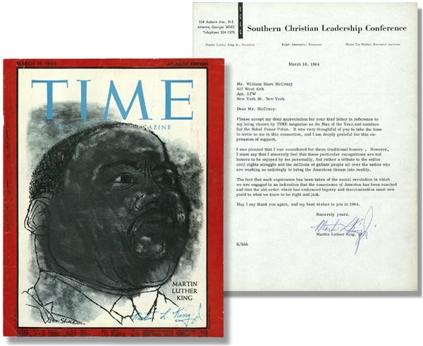 Typed signed letter dated March 10, 1964 is signed in bold blue ballpoint by Dr. Martin Luther King, Jr. Signature grades "10" out of a possible 10. An important and historic letter typed on 8.5 x 11" "Southern Christian Leadership Conference" letterhead, it is addressed to Mr. McCrary with regards to his nomination for the Nobel Peace Prize: "Please accept my deep appreciation for your kind letter in referenece to my being chosen by TIME magazine as its Man of the Year, and nominee for the Nobel Peace Prize... I must say that I sincerely feel that these particular recognitions are not honors to be enjoyed by me personally, but rather a tribute to the entire civil rights struggle..." A most pertinent letter from this famed period in Dr. King's civil rights movement, in which he at age 35 (the youngest person ever to be awarded the honor) announced that he would turn over the prize money of $54,123 for his Nobel Prize selection, to the furtherance of the civil rights movement. Letter is Near Mint. Comes with cover of the TIME magazine (March 19, 1965) in which the article was printed.