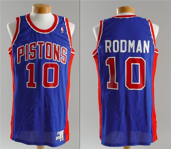 Back in the innocent days, before he began to accessorize with stiletto heels and pink chiffon, "the Worm" was a lunchbucket kind of guy contributing to Pistons' championship mix with stifling defense and lusty rebounding. In 1988-89 he was named to the NBA's All-Defensive team for the first of 7 times, and for good measure led the loop in field goal percentage (.595). Rodman's mesh road jersey from that year has "Pistons" and "10" screened in red and white on front and back, and "Rodman" in white on back. Red and white elastic trimming on collar, shoulders and sides. Tagging is "MacGregor Sand-Knit" [size] 42" with "88" and "2N LB" tags. Great jersey shows use.