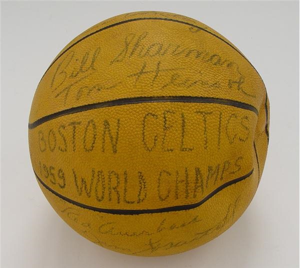 Official "Intercollegiate 100" basketball sports thirteen signatures penned by members of the 1959 NBA Champion Boston Celtics. Vintage blue and black ink signatures include: Red Auerbach, Bill Russell, Sam Jones, Bob Cousy, Bill Sharman, Tom Heinsohn, Jim Loscutoff, Gene Conley, Frank Ramsey, K.C. Jones, Bennie Swain (light), Lou Tsioropoulos, and more. NM (unless noted) signatures on a NM ball. Team signed basketballs from this era are tough to come by.