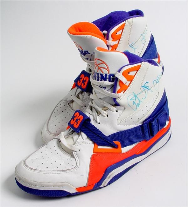Custom manufactured “Patrick Ewing” model high tops accompanied the perennial All Star New York Knick onto the court for some of his hardwood heroics. (If we could just forget that ill-fated finger roll.) This flashy pair shows nice use, each is signed on the heel in turquoise ink. Nicely constructed with his embroidered “33” on each heel and again on the front straps. Soles bear the name synonomous with Knicks basketball for 17 Hall of Fame caliber seasons, “EWING”.