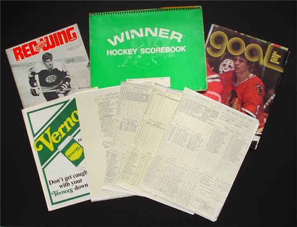 Chicago Blackhawks game day program from Bobby Orr's final match includes the magazine, line-up insert dated Oct. 28, 1978, press notes, final stats sheets and a hand scored scorebook from the game. Program is in very good condition. Also included is a tight copy of the March 16, 1971 Detroit Red Wings program with an action shot of Bobby Orr on the cover from Gordie Howe and Orr's last on-ice meeting.