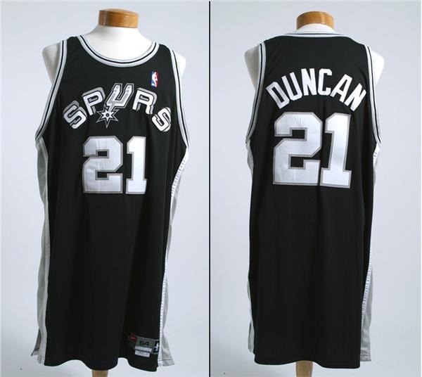 “The Big Fundamental”, his nickname says it all. The two-time MVP and six-time All-NBA selection doesn’t dazzle his opponents, he just destroys them with the basics. From Tim’s 2000-01 season is his black road gamer with two-color white and gray lettering and numbers and black polyester side panels. “Spurs 21”, arches across the chest with “Duncan 21” on verso. The tail is tagged, “Nike [size] 54” with “Length +4” flag tag along with the “Spurs” team tag and the “NBA Authentics” tag. Excellent use and one of the nicest Duncan jerseys we have seen, or will.