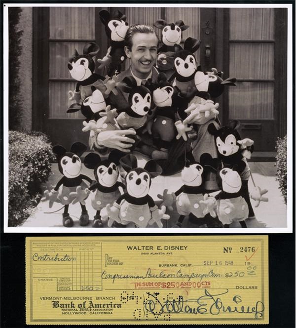 Bold and artistic signature in rich blue fountain pen, a 10 out of 10 for the autograph itself, the only flaw is that the perforations go through the “Walt", but this is very minor. Condition of check is EX+ it was previously folded. Personal check lists his residence "2400 Alameda Ave., and is for what was then, a large sum of $250 and payable to the order of Congressman Paulson's campaign. Photo comes with a famous photograph of Walt surrounded by the Charlotte Clark Mickey dolls (the first ever).