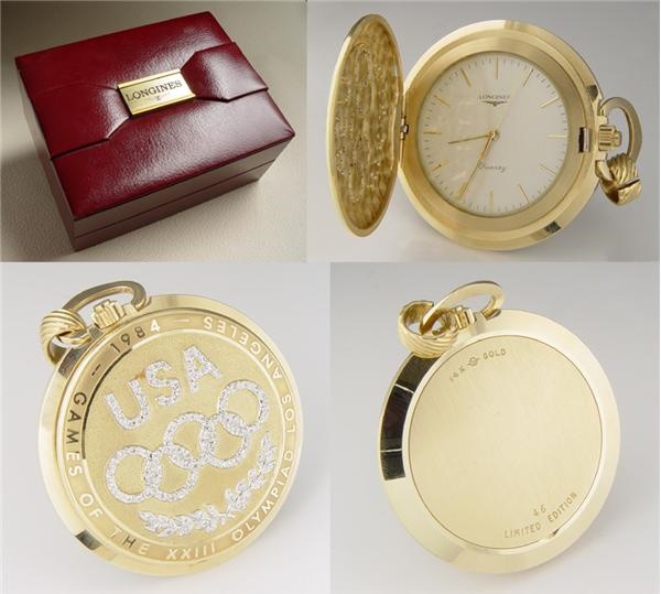 Stunning 14-karat gold Longines quartz pocket watch (1.75” in diameter) is adorned with (104) sparkling full cut diamonds. One of only 1,000 produced, this is one impressive looking piece of jewelry displaying the letters “USA” along with the five Olympic rings and ivy below, all in diamonds on the front cover. Around the perimeter in raised lettering: “1984 Games of the XXIII Olympiad, Los Angeles.” Engraved on back: “Limited Edition 46, 14 K Gold.” Comes in its original felt pouch within red leather-lined wooden case. Near Mint condition. Also comes with original COA and warranty.