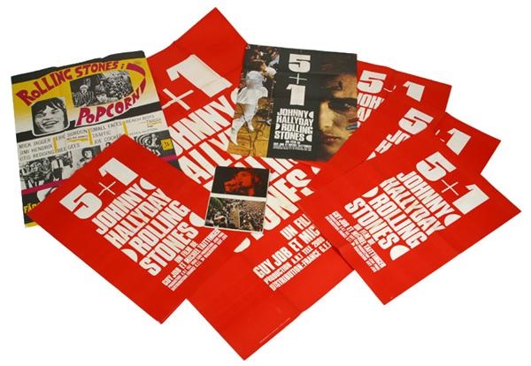 Arcane Rolling Stones movie posters, primarily for the obscure, never released in the U.S. "5+1" (1969), a Stones concert that summer in Hyde Park before half a million fans. 6 of these are red with white letters, in French, with the Stones taking 2nd billing to French singer Johnny Hallyday. 5 are 21 x 28", 1 is 27 x 40". Also a color version, a fold-put pamphlet in English, French and German; and a 27 x 40" German poster for the late '60s flick "Popcorn", with performances by the Stones, Beach Boys, Jimi Hendrix, Joe Cocker, Otis Redding, etc. Poster generally EX, some MT.