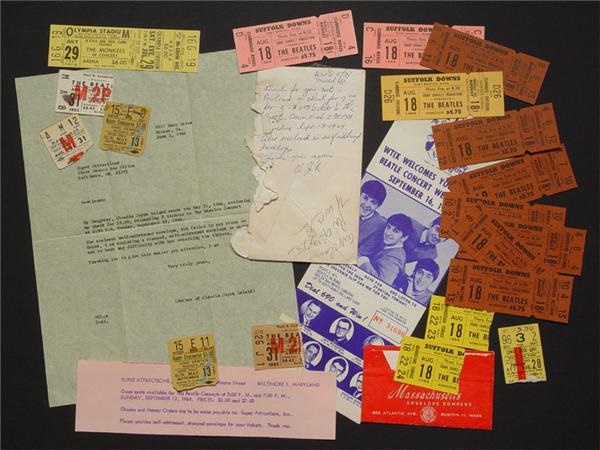 Spate of Beatles tickets from their '65 American tour: Boston's Suffolk Downs Aug. 18 (12), White Sox Park August 20 (1), Cow Palace August 31 (3), Baltimore Civic Center September 13 (2) -- plus a flyer from the Baltimore gig, letter from a mother of a fan to the box office, as well as a flyer from radio station WTIX for the September 16th New Orleans concert. All items EX-NRMT. Also a ticket from a "Pre-fab 4" concert, the Monkees at Detroit's Olympia Stadium July 29, 1967.