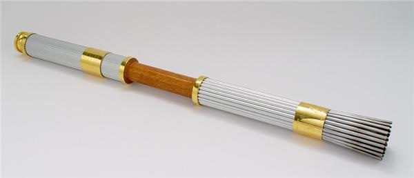 Stylish contemporary torch from the 1996 Olympic Games in Atlanta. Gray and brown with gold metal trim and measures approximately 32" tall. The logo of the Atlanta games is engraved onto a gold band near the top while the gold band on the handle lists all previous Summer Olympics and their host cities dating back to Athens in 1896. The flame holder and handle are separated by engravings of the Olympic Rings. Beautiful torch shows light use and is NRMT.