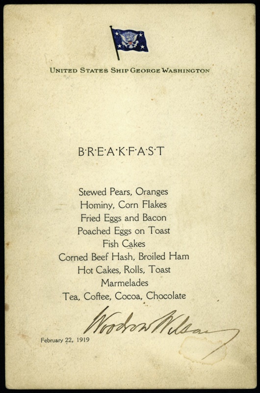 President Woodrow Wilson signed this breakfast menu on board the U.S.S. George Washington, the ship that took him to and from the Paris Peace Conference in 1919. When he returned to the U.S., Wilson's idealism for a League of Nations was shot down by the Congress, which rejected the U.S. from participating. Wilson's tireless efforts caused his health to suffer, and became a virtual invalid. The menu measures approximately 3 3/4 x 5 1/2" and says, "United States Ship George Washington" in small letters acrows the top beneath the blue presidential flag. Date is February 22, 1919. Wilson signed in black fountain ink above the date. His signature rates an "8" out of a possible 10. The breakfast menu is included on the card. NRMT.