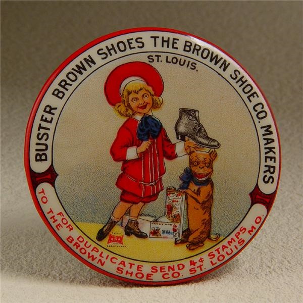 Celluloid mirror advertises "Buster Brown Shoes the Brown Shoe Co St Louis Mo.". Mirror is in pristine mint condition, the colors are brilliant with amazing and intricate detail. It is a premium as it reads "For Duplicate Send 4 Cents Stamps" with a St Louis address. Measures 2 1/8" in diameter.
