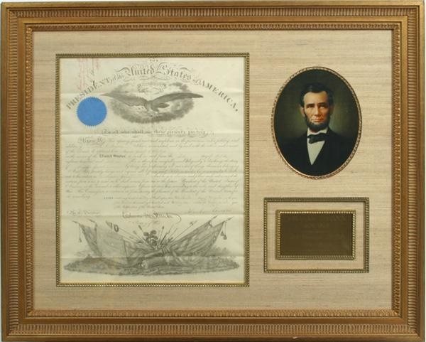 Abraham Lincon served as President during one of the most desperate times in our Nation's history. Often viewed as courageous innovator, whose life ended as a martyr, it is no wonder that there is such a strong demand for Lincoln related memorabilia. Offered is a large Presidential document signed by Lincoln during the height of the Civil War. The piece measures approx. 13.5 x 17.5", and appoints Lovett H. Rousseau to the position of "Brigadier General of Volunteers". Dated March 11, 1862, the 16th President has penned his full name ("Abraham Lincoln") on the document in bold (8/10) black ink. The ornate relic is also signed by Secretary of War, E.M. Stanton, whose status would later lead to the impeachment of Andrew Johnson. The appointment is exceptionally clean, and remains in overall Near Mint condition, save for two small, unimportant tears along one of the fold lines. Handsomely matted and framed with an attractive image of Lincoln, and a metal name plate, to an overall size of 29.5 x 24.5".