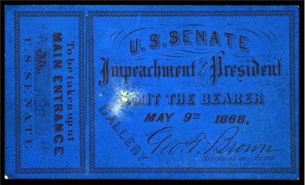 In May, 1868, the Senate came within a single vote of removing a president from office. Although Andrew Johnson's impeachment trial was ostensibly about other matters, it was essentially a circus orchestrated by his political enemies. Sound familiar? This unused ticket for Johnson's trial in the Senate chamber is a profound artifact. Dated May 9, a week before the final vote, the blue ticket to the gallery reads "U.S. Senate Impeachment of the President". EX with a slight patch of discoloration.