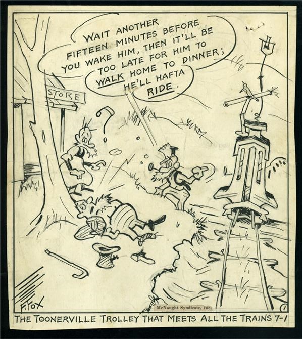 Fontaine Fox's classic Toonerville cartoon was originally drawn in 1908 and called "The Toonerville Folks," but later run as the "Toonerville Trolley." The strip was drawn continuously from 1908 until 1955 and appeared in over 300 newspapers at its peak in the mid 1930s. The offered original art is undated, but probably dates from the 1930s. It is in overall Excellent condition with a light centerfold and two staple holes on the upper half of the panel. 8 x 9.5 inches.