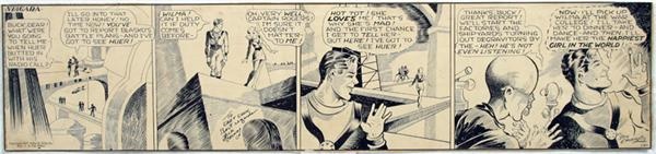 A fantastic original piece of Buck Rogers art, the handy work of Dick Calkins. The strip which features Buck Rogers with Wilma Deering, has been dedicated to Chet Cook and signed twice by the artist. Cook was a WWII hero, who met Calkins while he was being treated in the hospital after being wounded by the enemy. Calkins dailys are extremely rare - fewer than 10 early works are known to exist and only a few are in fine condition like this one. Excellent with the John F. Dille Co., 1937 copyright printed on front. Measures 5x22".