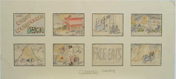 Eight frames of original artwork for the popular, Woody Woodpecker cartoon are original story boards created in 1951 by legendary cartoonist, Walter Lantz, who has signed the artwork on the matting in black fountain ink. The eight panels of the story are matted together for this episode entitled, "The Woody Woodpecker Polka" including the title card. Artwork is Graphite and color pencil on paper, a one of a kind original emanating from the Walter Lantz studios. Each frame measures approx. 4x5.5" and entire piece measures 31.5x14.5".