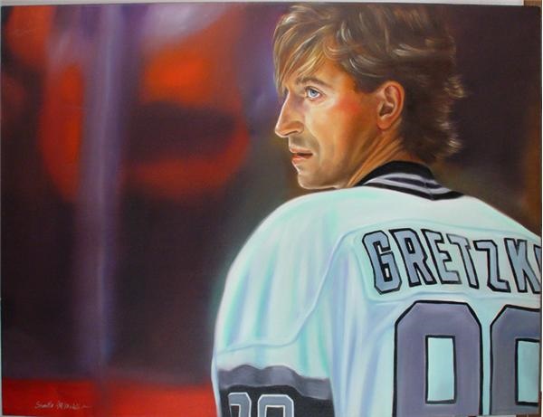 Internationally celebrated artist Samantha Wendell paints in a style perfectly timed to capture the moment of concentration when athletes, musicians, actors and the like are unrivaled. Whether it be at the height of competition, or the height of a performance, Samantha is able to portray both the agony and the ecstacy of the moment intimately. Her sports originals command prices in the $5000 - $10,000 range and more info can be obtained at www.SamanthaWendell.com. The Great One. Original oil painting stretched on canvas. This is the painting that was shown in ESPN's "Sports Century - Wayne Gretzky" video. Signed by the artist on front and titled on back by artist. An extact likeness of the game's greatest skater. Simply stunning.