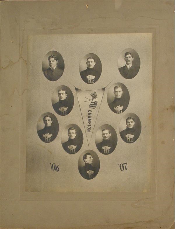 In 1907, leagues in Canada voted to allow professional players within their ranks, signaling the demise of the International Hockey League based out of the States. Players would soon trickle back across the border, lured by the large paychecks that had earlier made the IHL so attractive. This original presentational cabinet photograph displays the final 1906-07 incarnation of Portage Lakes Lakers of the IHL, the world's first professional hockey team. Still in the line-up are Hall-of-Famers Fred "Cyclone" Taylor and Bruce Stuart with regulars Fred Lake and Grindy Forester. Portage Lakes once again captured the Championship of the International League in 1907. Extremely scarce as these large cabinet photos were produced to be presented to the team members. Original photo image measures 11x14" with a matted size of 16x20". In excellent condition with areas of light staining on the matte. An attractive tribute to hockey's early history.