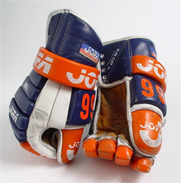 Wayne Gretzky’s historic hands filled these gloves as he rewrote the record books in Edmonton. Jofa model 686L with the extended cuff and “Jofa” across the wrist roll. Wayne’s number “99” decal is clearly visible on each thumb. This style was worn by Gretz during the late Eighties and each glove displays obvious game wear including blue staining inside the right palm from contact with the blue gripper on the sticks he used during his last season as an Edmonton Oiler. Letter of Authenticity from Brad Foote.