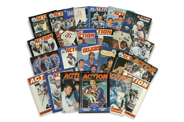 Scarce collection of twenty-five different Edmonton Oilers programs, each featuring Wayne Gretzky on the cover. This run, dating back to 1982 and continuing on through 1988, would be hard to put together again as these night game programs were produced in extremely low numbers. Condition varies, overall Excellent, with a number of score sheets neatly filled in. A great grouping of Gretzky publications.