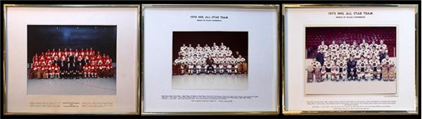 Darryl Sittler's participation in the 1975 and 1978 NHL All Star games and the historic 1976 Team Canada Cup are captured in these three official presentational team photographs. Darryl scored the winning goal for Team Canada in the 1976 Canada Cup. Each is professionally matted and framed, each with team rosters listed below. Largest is 16x20”. From the personal collection of Darryl Sittler with his signed Letter of Authenticity