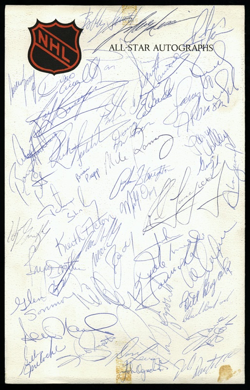 Amazing hand-signed record of those who took to the ice for the 1982 NHL All Star Classic in Washington. Players and coaches who have added their mark include: Gretzky, Messier, Bossy, Ciccarelli, Smith, Robinson, Fuhr, Arbour, Taylor, Coffey, Barber, Trottier, Stastny, Phil Esposito, Hawerchuk, Savard, Bourque. A total of 53 signers, all on the back autograph page of the Feb. 8th, 1982 NHL All Star Dinner & Lester Patrick Award Presentations program. Bold ballpoint signatures including a very early Gretzky style.