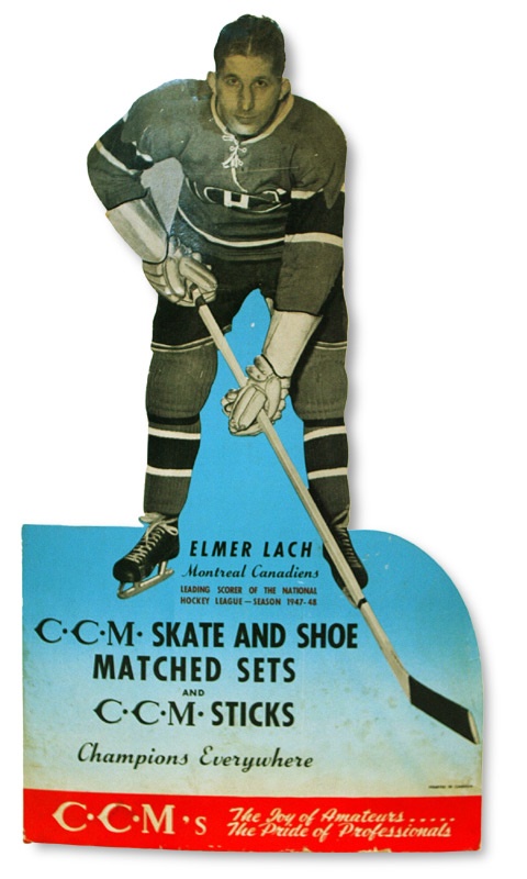 Colorful twenty-inch CCM hockey advertising stand-up with easel back picturing Hall-of-Famer Elmer Lach. Some water rippling at the bottom and light staining at the top. 1940’s. Easel back is intact and fully functional. Procalims “Leading Scorer of the National Hockey League - Season 1947-48".