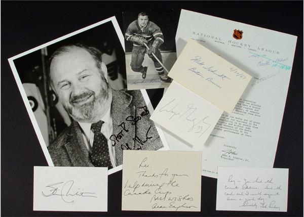 Large binder holds sixty signed Hall of Fame autographs including a number of deceased signatures. Inside are: Tommy Ivan & Bill Wirtz signed contract, Alan Eagleson signed Thank You card, Gene Hart signed 8x10, Wayne Gretzky vintage-signed note card (amazing), John Ziegler signed NHL Letter, HOF passes signed by Rayner and Sittler, Tommy Ivan letter, Harry Watson letter, Lefty Reid HOF letter (cool), Dickie Moore postcard, Bill Chadwick cut with photo. A large number of 3x5 index cards have been autographed by: Schmidt, Trembley (dec.), Dumart (dec.), Lindsay, Bower, Mikita, Parent, Bouchard, Stanley, Lach, Gadbsy, Lapointe, Boivan, Lebel, Torrey, Butterfield, Snider, Goldsworthy (dec.) Big M, Mathers, Rayner, Howell, Bucyk, Savard, Sittler, Reardon, Gainey, Moore, Shutt, Tretiak, Laperierre, Bathgate, Hall, Sinden, Johnson, Keon, Pilote and Park. A few duplications in the bunch.