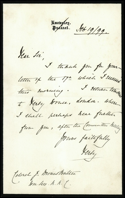 Although he never witnessed a championship game, Frederick Arthur Stanley, Governor General to Canada, purchased for the price of ten guineas a trophy bearing his name for presentation to the amateur hockey champions of Canada. The Stanley Cup has since become the symbol of professional hockey supremacy. As Lord Stanley died in 1908 his autograph is usually absent from even the most complete of Hall-of-Fame collections. This single-page letter is entirely in Stanley’s hand and has been elegantly signed at the bottom "Derby" and dated Feb 19, 1899. It is on letterhead from the Derby estate at Knowsley and is addressed to Colonel Mountbatten. Stanley signed as Derby from the time he gained the title in 1892 until his death. In addition, the content of the letter also contains the word “Derby”, in handwriting nearly identical to the signature below. One slight fold, otherwise in perfect condition.