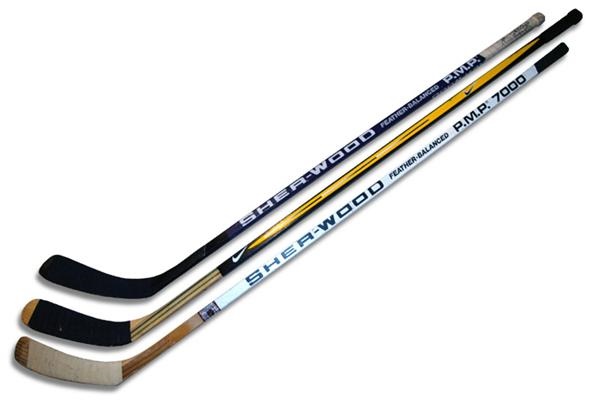 Recently game used Mario Lemieux Nike correctly taped with “bulldog” on the blade and the tapered black cloth tape knob. Luc Robitaille's Sherwood 7000, signed on the blade. Guy Lafleur game used purple Sherwood from later in his career, signed up on the white handle tape. Each is taped on the blade and knob with proper factory name stampings. No cracking or damage.