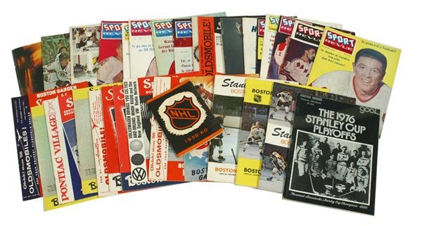 Fantastic collection of Bruins hockey programs and hockey magazines dating from the 1950s, 60s and 70s. Covers feature many famous Bruins like Vic Stasiuk, John Bucyk, Frank Brimsek, Babe Seibert, Wayne Cashman and many more. Playoff programs from 1971, 76, 77 and 78 are featured with photos of Orr, Esposito, Cheevers, Cashman, Sanderson and many others. Two Bruins yearbooks from from 1974-75 and 75-76 featuring Bobby Orr on the cover are also included. 15 Hockey magazines from 1960 are also here with vintage photographs from early hockey stars. Some are in French and have a few signatures from players like Harry Lumley and Vic Stasiuk. Full color covers show Glenn Hall, Gordie Howe, Rocket Richard and other greats from this period. The Official NHL Guide and Record Book from 1959-60 with the NHL logo on the cover completes this collection. Average condition is EX-MT.