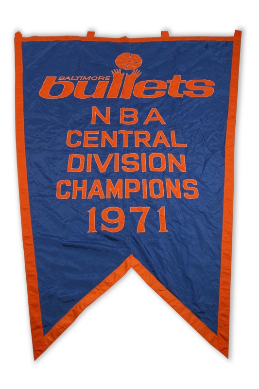 Gorgeous blue and orange nylon banner that hung from the rafters in the Civic Center conjures up fleeting images of Earl Monroe's scoop shot, Wes Unseld's Buick-like presence inside and Gus Johnson sweeping the boards clean. Bullets beat the their nemesis the Knicks in the Eastern Finals before being unceremoniously swept by Kareem's Milwaukee Bucks in the Finals. Banner is NRMT and a lasting echo of a class act that always played hard and tough.