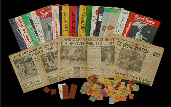 Great collection of Celtics programs (12), ticket stubs, and more spans the early 1950s through 1970s. Features many playoff programs including 1961 vs. the Syracuse Nationals, 1963 vs. Royals, 1968 vs. the 76ers & 1962 vs. the Warriors and Lakers. Other programs include "Tom Sanders Night" on January 19, 1973, a 1952 Celtics-Minneapolis Lakers program with rosters for the Harlem Globetrotters and Washington Generals, three 1953-54 programs and a program dating to the Celtics second year (47-48) against the Philadelphia Warriors. Also includes a 1965-66 Celtics Yearbook, newspaper clippings from '62 NBA Finals, and over 100 Celtics ticket stubs from the 50's-70's (includes tickets from the thrilling overtime finish of the 1962 Finals). Averages EX-MT.