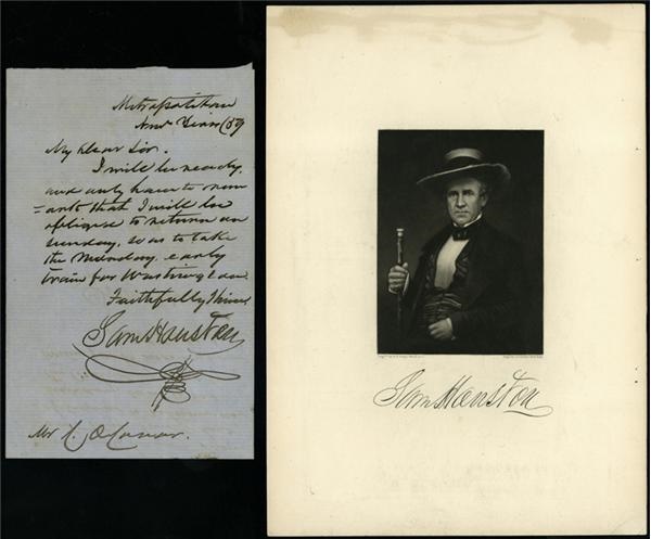 Handwritten letter from the man for whom they named Houston, Texas. Discusses his return to Washington while serving in the Congress of the Republic of Texas. Comes with a photogravure of Sam, with a facsimile signature. What’s most interesting about the letter is his mark under the signature, used to prevent forgeries in the 18th and early 19th centuries. His is most ornate and decorous, the mark of a truly flamboyant personality. The lettering and signature is bold, beautiful and pristine. Letter is 5x7.75” and the photogravure is 7.5x10.5”. Photogravure is Excellent