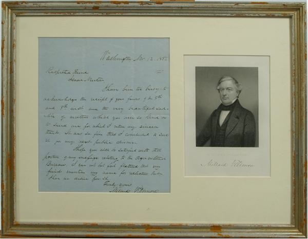 Original handwritten letter by President Millard Fillmore in black fountain ink on light blue writing paper dated November 12, 1851. The letter was written as a thank you to a friend and discusses an appointment to the Agriculture Bureau. Singed, "Truly yours, Millard Fillmore", the signature rates a "9" out of a possible 10. The letter is matted along with a 7" X 5 1/2" print of Fillmore in a handsome frame. The letter shows some original folds but is NRMT.