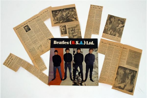 Beautiful Beatles concert program measures approximately 12" X 12" and has a full color cover showing all four Beatles in blue shirts and jeans. The program is titled "Beatles (U.S.A.) Ltd." A ticket stub from the August 21, 1966 concert at Crosley Field in Cincinnati is stapled to the first page of the program. Also inside the program are photographs and articles from the Cincinnati Enquirer covering the concert. The program has fantastic photos of "The Fab Four" and some great vintage advertisements. NRMT.